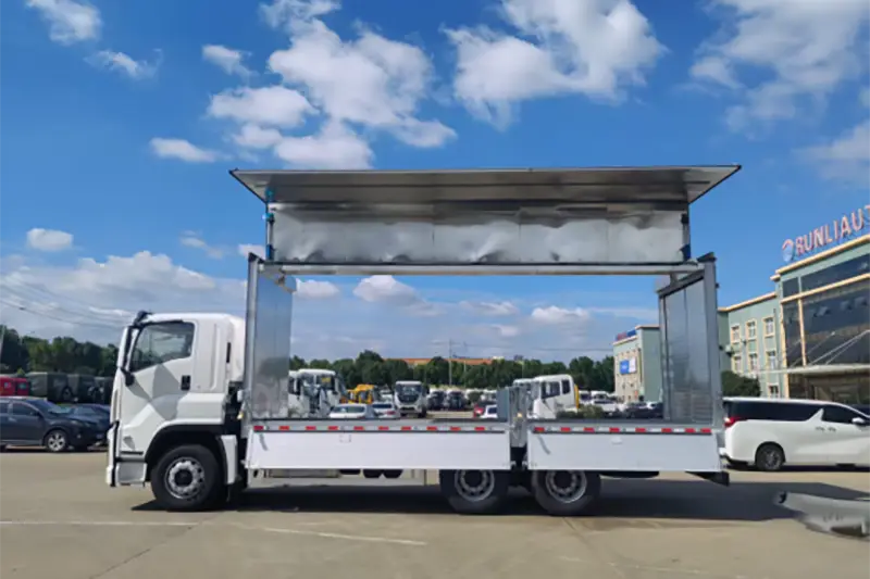 The Runli Aluminum Alloy Wingspan Truck, also widely known as a wing-opening van or side-unfold box truck, is a high-performance special truck modified from genuine Isuzu 6X4 chassis, upgraded to solve the low loading-unloading efficiency pain point for large, heavy and oversized cargo. Unlike traditional rear-only opening box trucks, its cargo box side panels and half roof hydraulically unfold like wings, creating a spacious three-dimensional loading area that supports multi-directional handling from the side, front and rear. It is a core logistics transport tool widely used in global bulk cargo distribution, industrial equipment delivery and agricultural products shipping, perfectly balancing cargo protection and handling efficiency for international wholesale buyers and dedicated logistics enterprises.